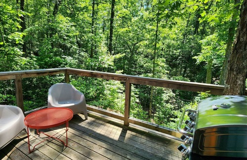 Nestled above the forest floor along the winding creek, the Bohemian Treehouse offers a truly unique and unforgettable escape. Awake each morning surrounded by nature's beauty, then step outside to your private deck to sip coffee and grill up a delicious breakfast. After a day of hiking, biking, or simply relaxing, rinse off in the spacious stone shower with skylights that flood the space with natural light. End the night cozy and comfortable in the loft with a queen bed. Climate-control with heating and air conditioning and a kitchenette with mini fridge, coffee maker, toaster, and microwave ensure the comforts of home.