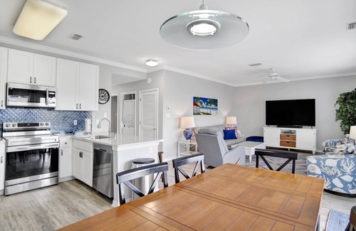 • The kitchen is fully equipped with everything that you could need in your home away from home. The dining room table seats six, and there are three bar stools for additional seating.