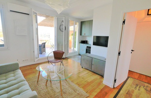 CARRE D OR OF THE HYPER CITY CENTER. ROOF TERRACE IN A QUIET AND NOT OVERVIEW. ASSURED CRUSH. Located 5 minutes walk from the beaches and the Promenade des Anglais, on the 6th and last floor of a beautiful bourgeois building with elevator (corner Rue du Congrès / Maréchal Joffre), magnificent bright and crossing F2 completely renovated and nicely decorated . Superb private terrace of 25 m2 both sunny and shaded with dining area and relaxation area offering a lovely view of the Nice hills of Cimiez, the Imperial Park and Mont Boron). Pleasant living room opening directly onto the terrace. Fully equipped kitchen: induction hob, hood, oven, microwave, fridge-freezer). Quiet bedroom with storage cupboard, bathroom with WC and window. Washing machine and drying rack on the terrace. Air conditioning, WIFI, Netflix. Shops, leisure, restaurants, pedestrian street, Place Masséna and old Nice nearby. Two nearby tram stations (line 1 Jean Médecin and line 2 Alsace-Lorraine).