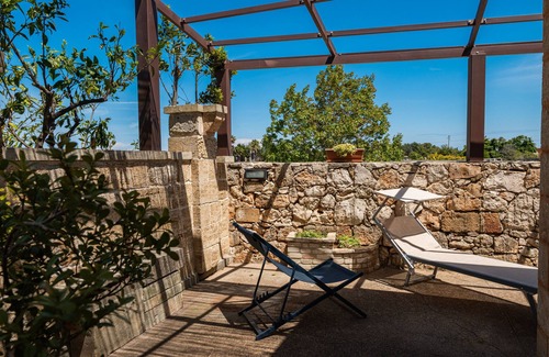 Angeli Nel Salento Country House in Santa Cesarea Terme offers you a shared terrace, a garden with barbecue, and a private park with palm and olive trees. Each unit has a private outdoor patio with table, folding chairs, and loungers for relaxing under the Salento sky.