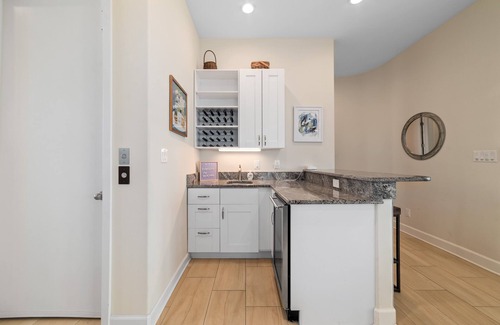 There is room for a large group of friends and family to spread out with privacy. There is a large living area on each floor with 65-inch TVs and fabulous views of the Gulf. The house is ADA compliant with an elevator. Please note: the elevator is for medical use ONLY! The first floor has a huge living/dining and kitchen area. The gourmet kitchen has granite counter tops, and stainless-steel appliances, including two dishwashers. A wet bar with a wine/drink cooler is located next to the kitchen area. An additional full-size refrigerator is in the utility room, adjacent to the kitchen. The two dining tables seat up to 20 people. The kitchen/ breakfast bar seats four. The living area is open and airy, has plenty of comfortable seating, including a large sectional sleeper, a 65 inch TV, and opens onto the 9 x 53 foot covered Gulf front deck. This beautiful covered deck has a big dining table and plenty of other seating. There are two bedrooms on this floor. The master suite with a door to the Gulf front deck has a king bed, a queen sleeper sofa, a wall mounted TV, and a large mirror. The huge master bath has double vanity, a soaking tub for 2 and large shower with a ceiling mounted rain shower and one wall mounted shower. Bedroom 2 has a king bed, and twin bunk bed with views of the Sound and the Gulf. It also features a fun Neverland map wall mural! Next to this bedroom is a bathroom with shower which serves this bedroom and the main living area.