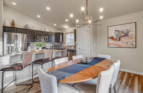 Room to spread out! Firepit patio! Pool table! Deck with grill & mountain views! Backyard games! This sparkling 4-bedroom, 3-bath home is like something out of a decorating magazine. Beautifully appointed with an open-concept living/dining/kitchen space, plus a separate family room with an enormous, cuddly U-shaped sofa for family movie nights. 3-car garage has EV charger. Primary bedroom suite has private bath with soaking tub & separate shower. Each bedroom is in it's own corner of the house for private sleeping quarters. In quaint Monument, just 10 minutes north of Colorado Springs.
