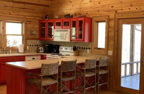 The custom-built cottage sleeps up to 10 people. It boasts a stacked rock wood-burning fireplace in the main living area, perfect for a fireside chat or cozy, cool evenings. The open floor plan has an equipped kitchen, countertop seating, a dining table, and a comfortable living space under the vaulted ceiling. The open-air deck and patio beckon you to commune with nature as you enjoy morning coffee among the trees.