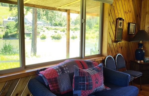 It is an inviting cabin with excellent views and property surroundings. There is easy river access. Plenty of seating on double-sided outside deck. There is a firepit with wood provided, and horseshoe pit.