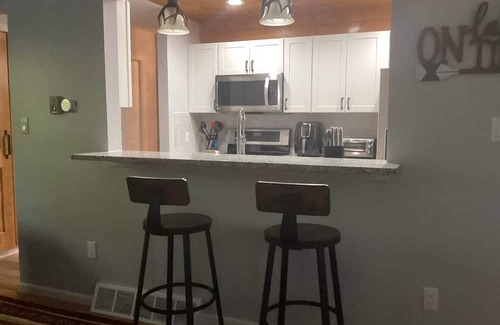 Our lake house boasts a unique charm with and inviting porch overlooking the peaceful woods. You'll find a warm and welcoming atmosphere, complete with plush furnishings and all the comforts of home. The spacious living room features large windows that let in plenty of natural light and offer stunning views of the surrounding landscape. It has a large fireplace to fully relax while watching a movie , sip wine or hot cocoa.