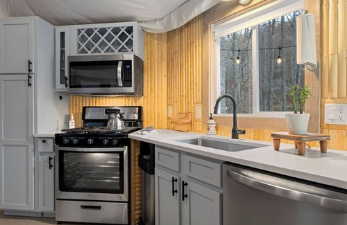 A private outdoor hot tub and a deep soaking tub in a spa-like indoor bathroom make for ideal relaxation spots, both surrounded by magical string lights. The outdoor setup includes a gas grill and a fire pit, perfect for evenings filled with s’mores and stargazing. With a leather armchair, loveseat, and an assortment of board games, this safari tent is designed for unwinding in luxury. Just steps away, trails through the Deep Creek area lead to waterfalls and scenic views, making this bamboo-adorned tent a romantic sanctuary in the Smoky Mountains, perfect for adventure and relaxation alike.