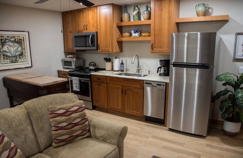 The lower lever features a living/kitchenette area complete with a refrigerator, stove, dishwasher, sink, granite counter tops and cabinets. Yes, a second kitchen!! The living/kitchenette area has double glass doors leading out to a deck area and the back yard. There is also a bedroom with a King size bed and another set of double glass doors to the deck and back yard. The bedroom has a second room in the back, with a twin bed and a barn door to close it off for privacy. Shared bathroom with shower. Utility room with a washer and dryer is also on the lower level.