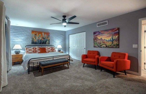 Inside, our four spacious bedrooms provide ample space for you and your loved ones to relax and rejuvenate. Each room is thoughtfully themed, from the rustic charm of the old west to the nostalgia of Route 66, immersing you in the rich culture of the Southwest.