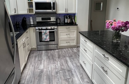 The house is comfortable, clean, open, new and modern-looking. Perfect for entertaining and has air conditioning. Quartz countertops with an island, and a skylight for natural light in the bathroom too. Two full bathrooms here. We just had the master bathroom remodelled and installed a fabulous new rain shower. The main full bathroom has a tub as well as a shower. 1 adjustable King and 2 Queens in this fabulous Oasis experience.