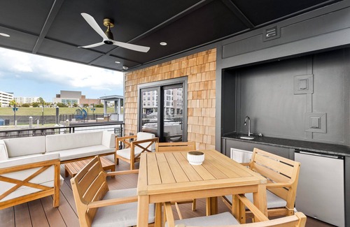 Just outside those doors, you'll find yourself on a large patio featuring an outdoor bar (sink & mini fridge), and a variety of comfortable furniture options. This patio is a fan favorite for everything from morning coffee, afternoon reading, evening spirits, or enjoying a meal. In the Summer months, you'll often hear live music coming from Marina Grill, our delicious on-site restaurant, or Live Oak Bank Pavilion Amphitheater, which is only a block away.