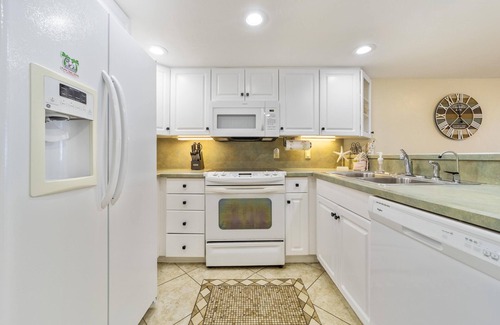 Decorated with an oceanside cottage retreat in mind, this popular rental is known for its comfortable furnishings. Unwind in the cooling air conditioning as you watch a movie or favorite show on one of the flat screen TVs. Sit on the balcony and read a book or simply enjoy the Florida sunshine! This condo also has a fully equipped kitchen, allowing you to prepare meals in the comfort of home. When it is time to call it a night, you will get an excellent night sleep. Two Bedrooms are upstairs, one has a King Bed and the other has two double beds.