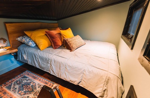The lower room hosts the kitchen, bathroom and lofted queen bed. Kick back and enjoy the old saloon vibes.