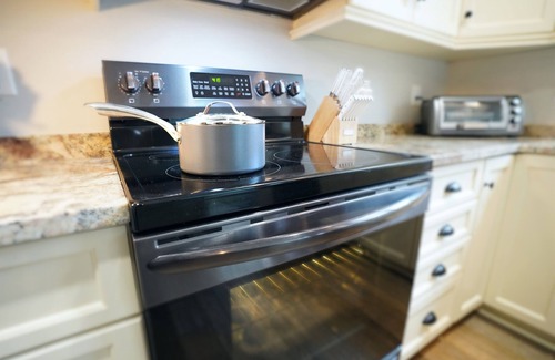 On the lower level of the house, you’ll find a second living area with patio access and a view of the expansive yard leading to the lake. The downstairs living area includes a large flatscreen smart TV, a Classic Ms. Pac-Man 14-in-1 Arcade Machine, and a nine-foot shuffleboard table. You'll also find a queen bedroom with lake views, a bunk bedroom to sleep four with lake views, and another bedroom to accommodate three. The lower level has two full baths for guests’ convenience.