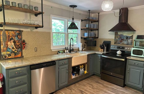 Step into the whimsical world of Sandy’s Mentone Magpie, a truly one-of-a-kind getaway within a boulder garden in Mentone, Alabama. Every inch of this home is a creative masterpiece, from hand-carved wood sculptures to vibrant woodland inspired mosaics and magpie murals.