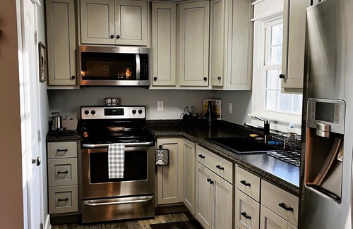 The Home: Come relax in this newly renovated home that has an open living room/dining room that extends into the fully equipped kitchen area (toaster, crockpot, microwave, stove, blender, refrigerator, and coffee/tea bar with Keurig). Enjoy all your favorite apps on the large tv in the family den or choose to relax with a book in the front living room (containing all new furniture and flooring). Each of the 3 bedrooms has a Smart TV and fast WIFI for your entertainment needs. The home comfortably sleeps 7 with 2 bedrooms outfitted with brand new queen beds and the 3rd bedroom having both a bunkbed (twin/twin) and a single bed. The 2nd bedroom also has cozy desk and chair for remote work or can also be used as a vanity/makeup area. The large hall bath has a tub while the 2nd full bathroom off of the den has a stand-up shower.