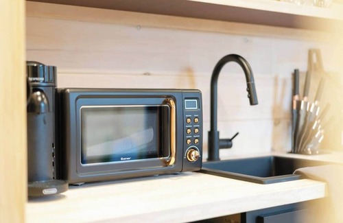 The fully equipped kitchenette allows you to prepare delicious meals. It includes a induction stovetop, mini refrigerator/freezer, microwave, and all the cookware and utensils you need. Enjoy your meals at the bistro table which also doubles as a workspace.