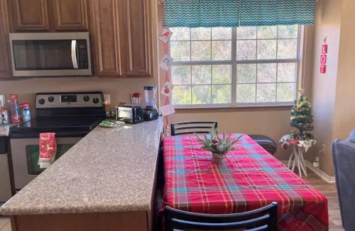 The extra privacy comes from being a top unit, one short flight of stairs up and no building next door, just trees, birds and nature! We are also a much quieter unit than the lower units. We have a washer&dryer for your use, as well as detergent. The large deck along the entire back is completely secluded. Nature views from every window. The condo has been totally remodeled. The beds are oriented to give the very best views of sunrise/sunset. Clothes washer & dryer. There’s a front porch where you can watch the activity at the nearby pool or the kids on the playground, tennis or basketball court. During Christmas time you can hear the Silver Dollar City Christmas Parade Music from the front porch. The Silver Dollar City rollercoaster can also be seen from Woodpecker Lane, just a very short stroll from our condo. Right past our building's charcoal grill, on the left of our unit, there's a path to the cove, that leads to the lake. Many of the trails here are marked - enter past Building #17, look for the signs right to the lake, left to the waterfall. There is everything you need to be active - basketball, tennis racquets/balls, folding chairs for lake side, lots of yard games and deck games. There are also plenty of magazines & books for the less active time. Enjoy the full cable tv - if you can find any free time to watch. Something for everyone to enjoy here! We do not allow any parties of any kind, including bachelor or bachelorette, gatherings. The condo and both decks are fire coded for seven people.There is a camera on the front porch for your safety.
