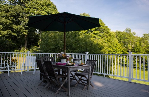 Nestled on a hillside above the scenic village of S. Woodstock, Apple Hill is a cozy year-round home with a large deck offering views of the Kedron Valley. The setting features fields and woods, with nearby farms. Take a 10 minute walk down the hill to S. Woodstock, and you'll find- a country store( with penny candy, and deli serving delicious take-out food); Kedron Valley Inn with fine dining and a wonderful beach/pond for swimming; historic church and academy.