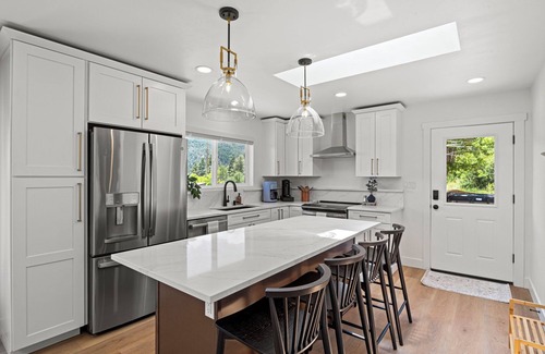 Both bedrooms have queen beds, and there's also a queen-sized pullout couch to ideally fit groups of 4-6.