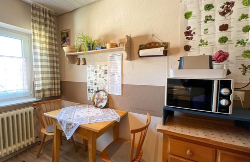 "Schleuniger", 3-room apartment 55 m2 on 1st floor. Simple and cosy furnishings: living/dining room with satellite TV. Exit to the balcony. 1 double bedroom. 1 room with 1 double sofabed (140 cm, length 190 cm). Exit to the balcony. Kitchen (oven, dishwasher, 4 ceramic glass hob hotplates, toaster, kettle, microwave, electric coffee machine) with dining table. Shower/WC. Oil heating. Balcony. Balcony furniture. View of the garden. Facilities: children's high chair, baby cot. Internet (WiFi). Please note: non-smokers only.