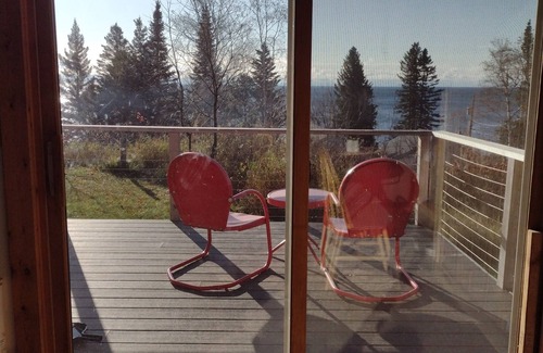 Adorably cozy cabin perched on ridge over-looking Lake Superior. Located only a couple miles from Grand Marais, "Scotch Pine" offers peaceful lake views and breezes in a private setting while remaining within easy reach of town. This newly remodeled (fall 2023) cabin is fresh and pristinely clean while maintaining the cozy charm of an original North Shore Cabin. With a queen bed in the bedroom and a second queen murphy bed stowed away nicely in the living room, the cabin is ideal for 1-4 guests. Families and friends alike will enjoy the large yard and campfire area. Prepare your meals in the well-stocked kitchen and enjoy dinner or a drink on the adjoining deck with a Big-Lake backdrop!