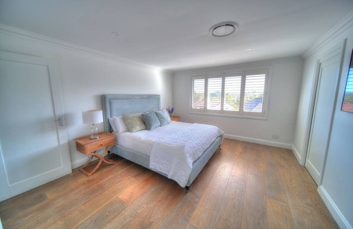 The property is split over two levels. On the upper level are all five bedrooms. The main bedroom has a king-sized bed and contains two WIRs and an ensuite. Bedroom 2 has a king single bed with a BIW and is located next to a study. Next are bedroom 3 and 4, which both have BIW, desks and queen-sized beds. The main bathroom is equipped with a shower, toilet and large corner bath. Bedrooms 2, 3 and 4 open onto the upstairs north facing balcony, where you can relax and enjoy your morning coffee or afternoon cocktail. Bedroom 5 has a king single bed, BIW and a desk.