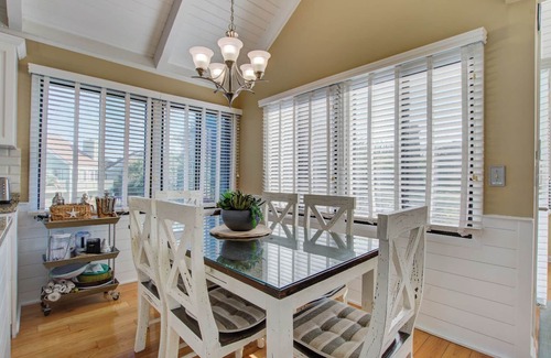 The bright and open living area is beautifully appointed with coastal-inspired décor, comfortable high-end furnishings, and a large flatscreen TV to watch all your favorite shows.