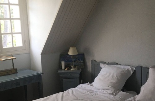 Accommodation: 1300 yards garden with pine trees on shore - lounge, dining room with oak beams, old Breton furniture, fireplace, well equipped kitchen (dishwasher), (microwave), reading room, TV, DVD recorder and CD recorder, shower room, separate WC. First Floor: 3 bedrooms (double, twins, single with washbasin). Garden furniture, 2 terraces, central heating. Open all year round. direct access to the coast