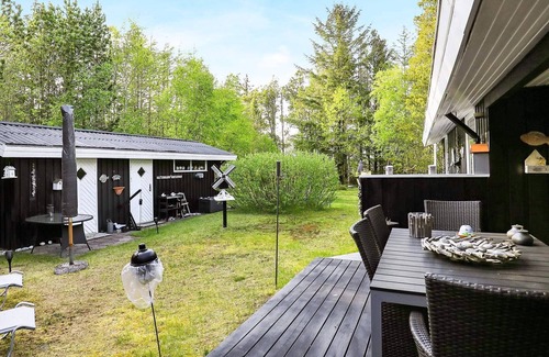 Holiday home located on a nice enclosed natural plot only approx. 300 meters from one of the area's best bathing beaches at Knasborg. The cottage is furnished with open kitchen to dining area and living room with wood burning stove. Bathroom with underfloor heating. There are two bedrooms in the house and in addition an associated annex with two beds. From the kitchen you can go out on a small east-facing terrace where the morning sun can be enjoyed. From the living room there is access to a covered south / west facing terrace with dinner and evening sun. Not for rent to youth groups.
