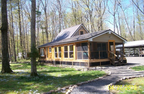 Up the stairs is a bedroom containing two singles and a full bed. Walking through to a Semi-private bedroom with a double bed. Also, enjoy the second story deck. Please. no more than 8 people on deck at any time. Downstairs is the master bedroom with a queen bed. With the 3 bedrooms, you can comfortably sleep 6 people. In the living room is a futon and a pull-out single bed if more sleeping needs are necessary. The cabin bathroom contains an eco-friendly composting toilet, with easy-to-follow posted directions for its use. Please, nothing other than toilet paper and composting materials in the toilet. There is a waste can for other paper and a small can on the floor for male or female personal hygiene products. There is a water container and an old-fashioned bowl and pitcher for quick wash-ups. Just a few steps from the cabin is the shower house. In this building, you will find two showers and a heated dressing room. Also, in this partially enclosed building you will find a double bowl sink which is our fish cleaning station. Here you can gather water for cooking, washing pots, pans, and utensils in provided basins, or cleaning your catch from the creek. If you feel like a real pioneer, feel free to use the outhouse. To the rear of the property is a large two-bay structure to keep your vehicles, or to store your kayaks and or bicycles. Also, a Gas grill. Follow posted rules on its use and remember to turn off the gas when done. On the screened-in porch, you will find an old glider and table for 4 to sit and sip your morning coffee or your afternoon beverage. Hanging on the porch are several mountain pie makers for your use at the fire ring, along with hot dog forks. Please, clean these before leaving and return to their proper place. The fire-ring area has lighting and power if you need to plug something in such as a crock-pot for your outside dining. There is also an old log holder and grills at the fire ring if you decide to prepare your meals on an open fire. We've found that the mountain pie makers work quite well to cook burgers.