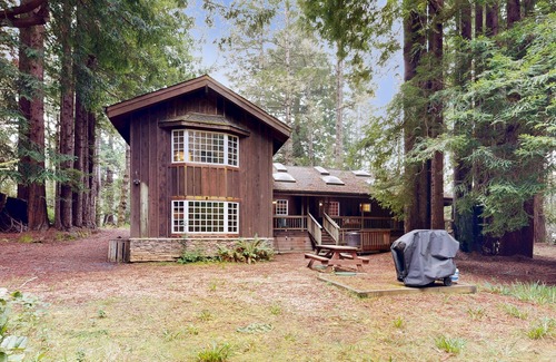 Spaciously laid out, this cabin-style home is designed for elbow room. Everyone can help make morning waffles in the spacious, fully equipped kitchen. The centrally-located living room is perfect for game nights, especially if there's a fire going in the wood-burning fireplace. Outside, explore the deck and picnic area set up around by the private gas grill. The hot tub is private and towels are provided! Younger guests will love the fairy ring and fun places to play within the woods. When it's time to turn in, guests can pick out a bedroom with a skylight or a bonus futon.