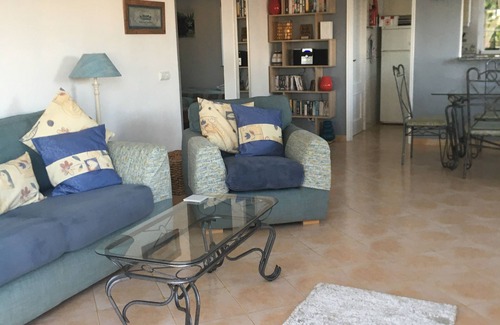 Our ground floor, sunny apartment is large, pleasant, bright and airy. It has an open plan living room and dining area. Patio doors lead onto a good sized south facing terrace with BBQ and patio furniture, as well as sun loungers. There is also a gate on the veranda to keep children or toddlers from going into the pool or garden area alone. There is a perfect view of the pool and garden from the veranda, lounge and main bedroom. Free WiFi and android TV via the internet, as well as a DVD and CD player. The kitchen is well equipped with pantry items, and features granite worktops and breakfast bar, a gas four ring hob with an electric oven, Bosch dishwasher, microwave, Bosch washing machine, fridge/freezer, coffee maker and cafeteria. There are two double sized bedrooms; one with a double bed, wardrobe, chest of drawers, and bedside tables. This bedroom has patio doors with a view over the pool. The second bedroom has twin beds, toilet and washbasin en-suite, with wardrobe, and bedside table with three drawers.