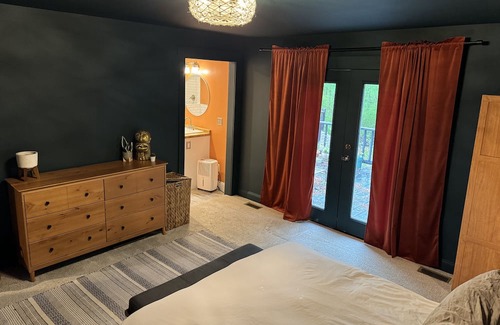 Step inside and discover a master bedroom adorned with a dark, moody, and luxurious queen bed, complemented by an ensuite bathroom featuring a relaxing tub, shower, and dual vanity. Enjoy your morning coffee or yoga on the private deck just off the bedroom, surrounded by the peaceful sounds of nature.