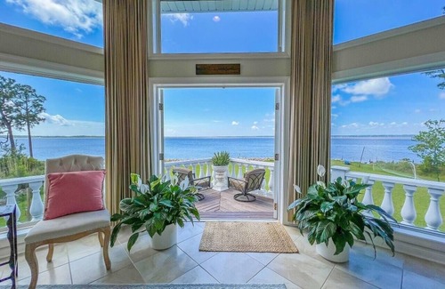 This stunning home on 5.5 acres on Escambia Bay has a great room with 180 degree views of the water!