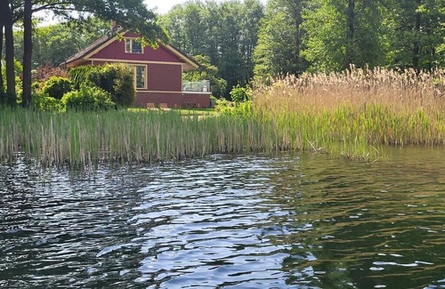 Vakantiehuis met rieten dak aan het Pinnower Meer in Godern met eigen grond aan het meer, toegang tot het meer, zandstrand, roeiboot, terras aan het meer, uitzicht op het meer nabij de hoofdstad Schwerin in Mecklenburg Vorpommern, Oostzee, vissen, zwemmen, vakantie, ontspanning, gezinsvakantie