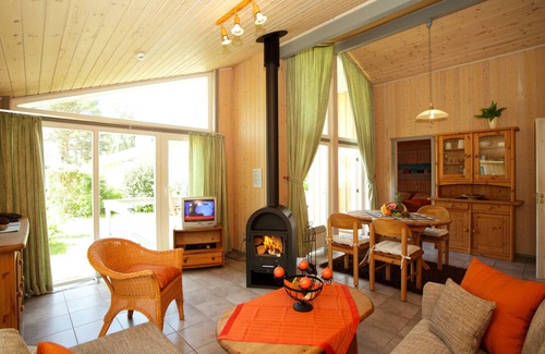 "Seeschwalbe", 3-room semi-detached house 77 m2. Cosy and wooden furniture furnishings: living/dining room with Scandinavian wood stove, cable TV and radio. Exit to the terrace. 1 double bedroom. 1 room with 2 beds. Open kitchen (4 hot plates, oven, dishwasher, electric coffee machine). Shower/WC, hydro massage bath, Sauna. Electric heating. Carpet. Terrace partly roofed, lawn 300 m2. Terrace furniture, box-room. Facilities: children's high chair, baby cot (extra). Internet (WiFi, free). Parking (1 car) at the house. Please note: smoke alarm.