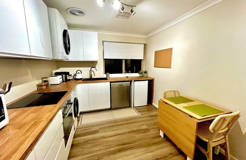 Stylish kitchen with oven & cooktop, dishwasher & fridge.
