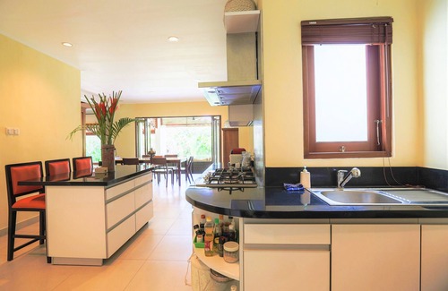 The two first bedrooms are located downstairs. Both have its own bathroom and possess air conditioning. The first one has two beds with a seating area. The other has king size bed. The spacious living room inside the villa overlooking the garden. You will feel comfortable thanks to all facilities such as Wifi internet access, Stereo/iPod docking in living room, and in one of the bedroom and poolside. Besides, the kitchen is all equipped.