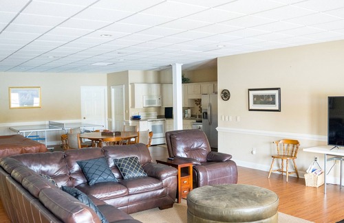 Downstairs has a large recreation area with a ping pong table, pool table, foosball table, smart tv, and DVD player. Lots of kids dvds available. Board games and kids toys are available. Poker table and chips, cards included.
