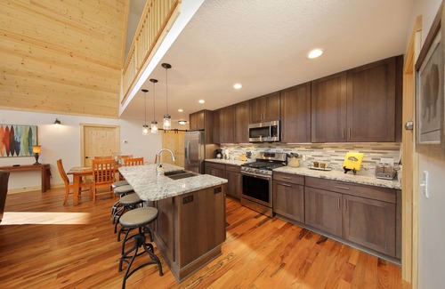 To book, navigate to vrbo.com\4455449. Serenade Shores is a newer home on 4+ acres overlooking a privately owned pond. Our newest addition is a floating dock! The location is 10 minutes from the entrance to Pisgah National Forest and 12 minutes from Dupont State Forest: a perfect jumping off spot for hikers, mountain bikers, fishermen, kayakers and anyone who enjoys the outdoors. We are also located just minutes from three boat launches on the French Broad River. If you need to work, we have high-speed cable wi-fi. We also have streaming cable TV via Comporium and FireStick. There are three smart TV's - one in the living room and one in each main level bedroom. The home has an open floor plan with plenty of south facing windows to take in the pond view and winter mountain and river views. There is a stone gas fireplace for chilly nights and a gas grill on the wide covered porch. There are two bedrooms with king-sized beds on the main level, each with a full bath (one is private and one opens to the laundry/mudroom) as well as a loft with a queen-sized bed and a full-sized Serta foldout sleeper loveseat (very comfortable with no bar). The finishes include oak and tile floors, stainless steel appliances (oven/range is gas), and granite countertops in the kitchen and baths. To view our other rental and reviews, check out VRBO #798487.
