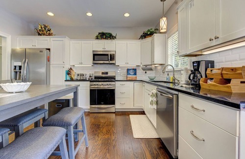 Inside, you'll find thoughtful touches that make every stay feel like home — a fully equipped kitchen with a Keurig and drip coffeemaker, a big screen TV for movie nights, and comfy bedrooms across 3 levels. The king suite offers added privacy with another big screen TV and an en-suite bathroom that features a walk-in shower and a garden tub for soothing soaks. The second bedroom has a queen bed, and the final bedroom has 2 twin beds; both have access to a shower/tub combo in the hallway. Plus, there's Wi-Fi, a washer/dryer, and keyless entry for an effortless stay.