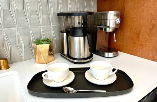 Make yourself at home at this updated 1958 Alexander mid-century home featured in the Modernism Tour 2022! You'll be centrally located in one of Palm Springs's best-preserved mid-century neighborhoods. The 1,584-square-foot home has an open floor plan with a wall of south-facing windows lining the entire living room with views of the enclosed backyard and pool with spa. The living room features a sectional and chairs, a smart TV, and a gorgeous dining table. The kitchen boasts stainless steel appliances, including a French-door fridge, oven, microwave, dishwasher, coffee maker, induction stove, and a breakfast bar with seating.