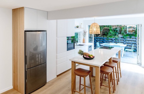This spacious Sunshine Beach home has just been fully renovated with high end Coastal luxury in mind. This home flows over two spacious levels so there is plenty of space for two couples or families with older children. The property is tucked away at the end of the complex and is surrounded by lush tropical trees for privacy. There is a courtyard to the front with bean bags for early morning coffee and reading. The front door flows into a beautiful living area with comfortable couch and smart TV. The modern kitchen has all mod cons including Nespresso compatable pod machine. Full laundry facilities and powder room are also on this level. The kitchen area flows to a private courtyard with alfresco dining, Weber BBQ and sun umbrella for those warm Noosa days. The courtyard is surrounded by beautiful native tropical plants and foliage. The property is fully air conditioned.