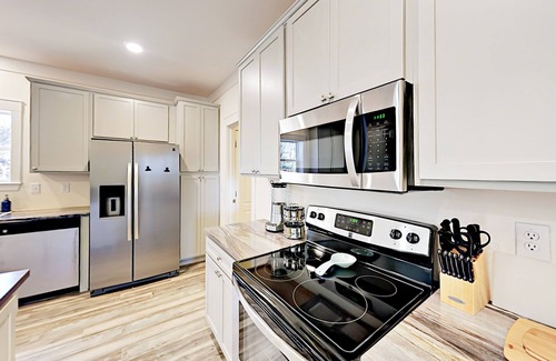 This one-story home sleeps 10 total in four bedrooms. Two full bathrooms are each stocked with plenty of plush towels and a complimentary starter supply of toiletries.