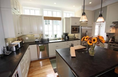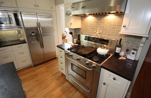 You can stay in this beautiful Tree Shaded South Facing Home. It is on one of Manhattan Beach's most desirable streets, close to downtown Manhattan Beach, the pier, numerous restaurants and shops not to mention steps away from the beach. Take a swim or play a game of volleyball, run, bike ride or take a walk along the Strand that goes for miles along the ocean. Enter the home to shining antique maple wood floors throughout and high ceilings with accent lighting. There is a grand piano and plenty of seating in front of the fireplace and doors that open wide to the patio outside. The dining area has a table for 8, Chandelier above and doors that open wide to the front patio, barbecue and table with 6 chairs under mature trees. The Kitchen/Living Room is next with a 32” Flat Screen TV, again plenty of room to sit and relax and or play our second piano. The Kitchen has a granite Island with sink, bar stools, stainless gas range, dishwasher, microwave and a large pantry. There is a powder room next to the Kitchen and then down a few steps to the laundry room and garage (storage). There is one parking space inside the garage, a second overflow space on the driveway outside, and lots of additional street parking (rare in Manhattan Beach!). Up the stairs to the 2nd level is a girl's bedroom that faces east and gets the morning sun. This room has bunk beds and an attached bathroom with a beautifully tiled shower. The boys room faces west and north and has a nice cool afternoon sea breeze and afternoon sun. There are bunk beds, a desk and an attached green tile bathroom with a tub/shower combo. The Guest room has west windows and a queen bed, attached bathroom with limestone tile and a white marble shower. Thru the hallway and up a few steps with skylights shining off the wood floors you pass a study and then a walk-in master closet on the right and the Master Bathroom on the left. The master bath is breathtaking. A pedestal tub is set next to the shower and natural light from the large windows above the tub illuminate the bright white tub and deep green extra-tall shower with seat. To complete this spectacular bathroom there is a personal wood paneled sauna. Just outside the master bath is the south facing master bedroom. Large windows with just the right amount of natural light all day. There is a queen bed, 2 plush chairs, 32” flat TV and your personal balcony with 2 lounge chairs and side tables. The 5th bedroom is up a ½ level and is a spacious game room/den with daybed. There is an attached bathroom with shower and beige tile. French doors open from this room to a huge 3rd floor deck with soft grass turf, two reclining steamers in full southwest sun for hours, 4 chairs and a table, and a view of the safest and friendliest neighborhood in Manhattan Beach.