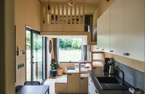 Dit charmante tiny house van 40 m² heeft een loft-stijl slaapgedeelte met een comfortabel bed, een moderne badkamer met douche en toilet, en een volledig uitgeruste keuken. De gezellige zithoek nodigt uit tot ontspanning. Geniet van het uitzicht op de groene omgeving vanaf je privéterras, ideaal voor een glas wijn of een goed boek. Het interieur is ontworpen met duurzaamheid in gedachten, zodat je kunt genieten van moderne voorzieningen in een natuurlijke setting.