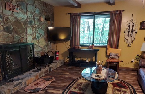 When darkness falls and you are finally forced to come inside, you have a wood burning fireplace, Wi-Fi, a computer desk, TV, DVD player, playing cards and board games. Large kitchen and living room with stone wood burning fireplace and wood ceiling beams adjacent gives plenty of open space to stretch out and enjoy. Bedtime gives you a large KING suite with adjoining half bath, a QUEEN bedroom. NO carpet in entire cabin, newly installed wood laminate throughout.