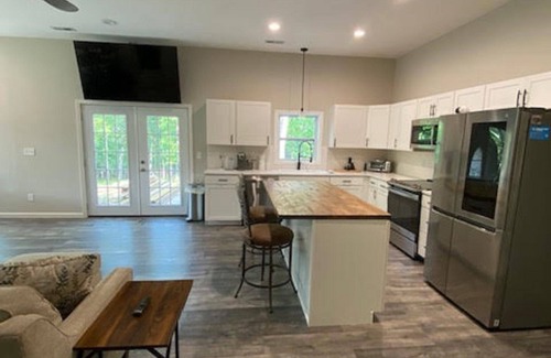 Why pick between the feel of a rustic cabin and a contemporary studio when you can have both at this Lake of the Ozarks vacation rental? This property provides a restful retreat with amenities with a full kitchen and free WiFi to help set the tone of your vacation. Guests can enjoy a lovely view of the forest and Trail down to the lake, a perfect summer pastime. As you sit in the morning with your coffee or evening drink you can enjoy the deer and turkey looking out the large, beautiful windows or sitting in the deck. Located within eleven acres of private nature reserve. You can fish from the dock or enjoy swimming off the swim platform. 1 private bedroom features a queen bed, and open bedroom featuring king bed in the living area. If you enjoy watching tv from bed there is a 52in tv in the living area for viewing from the sofa or the king bed. Wake up to the sun peeking through the trees and enjoy coffee on the deck as you watch the plentiful wildlife go about their morning routines. Cook breakfast in a full kitchen and take a stroll down to the waterfront where you can fish and enjoy the dock and swim platform.