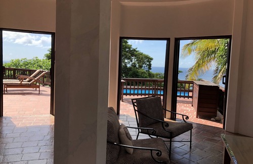 Located on the charming island of Carriacou in the heart of the best scuba diving in the Caribbean. Architecturally designed to replicate the Golden Mean shell spiral, this Cherry Hill estate is one of a kind. Fresco style painting surrounds the entry as you walk into the main salon while the views wrap you in tranquility. Large open spaces with doors and windows that bring the gentle year round Caribbean breezes into the home from every corner. large welcoming dining table for entertaining. Curved wall of 10' french doors welcome you to the large tile deck and the swimming pool as you watch the sailboats sail into Hillsborough. Privacy in the master suite includes an outdoor shower. 2nd bedroom in the main house also has it's own private patio. A short stroll down the drive welcomes you to the studio guest house with it's own kitchen and bathroom. Every space has been thoughtfully decorated to bring in the character and colors of it's natural surroundings. Secluded grounds offer welcoming cabanas for relaxing in hammocks on quiet afternoons. Local property manager will welcome you at the airport or dock for personal transport to the villa, as well as assist you with all aspects of planning for your private vacation: car rental, shopping, dining, scuba diving and exploring all that Carriacou has to offer. Numerous secluded beaches await you if you are looking for an authentic Caribbean vacation. This home is a true gem.