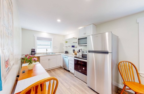 This cozy studio cottage comes complete with all the home trimmings and offers a convenient location nestled between the Rachel Carson Preserve and Kennebunk Beach. This family-friendly resort property features a playground, grills, picnic areas, cornhole/beanbag toss, a firepit, and a seasonal in-ground pool for added summer fun. Dock Square and downtown Kennebunkport attractions are less than three miles away. Inside the cottage, you'll find a renovated interior equipped with an updated full kitchen, plus additional perks like mounted mini-split air-conditioning. Shared laundry facilities are located on-site.